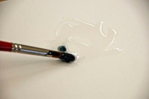 - Now, with the other brush, which has been dunked in the water, pick up a good blob of liquid pencil and gently introduce it into the blot of water. The liquid pencil should immediately start moving over the surface of the water. (Fig. 3)