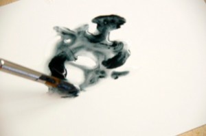- Continue to add streaks, blots and dabs of liquid pencil until you are satisfied with the result. The paper should not be moved at all, and remember not to add too much liquid paper or the result will be more sculptural and images will be harder to find. Return the brush to the other large water jar and clean it. (Fig. 4)