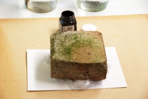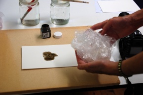 - Carefully place the clingwrap onto the blot, press down, and immediately put whatever you have chosen as a weight down and press again. Leave the weight on the blot and walk away. (Or start on another blot – not every one has images you can use.) (Fig. 6)