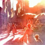 The finished painting should be mounted on acid-free paper before being framed, and handled carefully during the framing process. Moisture is the main danger – the painted surface seems fairly durable otherwise. I found this out the hard way when I realised (in the middle of the night) that I had left a folder with two unframed miniatures on the roof of the car when leaving the framer that afternoon. Of course it rained all night, and by the time I found the folder in the car-park it had been run over a few times and I expected the worst. The cardboard folder was falling apart, but luckily the miniatures themselves had been in individual plastic bags, and apart from one small corner where the damp had penetrated, they were undamaged – the plastic bags had tyre marks and gravel rash all over them, but somehow the paintings survived!